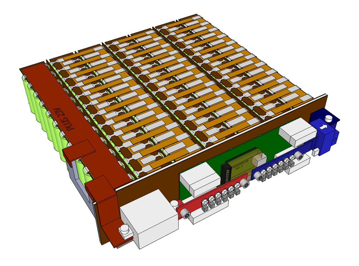 Für ein Projekt in der Automobilbranche wurde eine Batterie entwickelt, die auf engem Raum (370x370x80mm) knapp 3kW Dauerleistung und 10kW Spitzenleistung bei nominell 24V bereitstellen kann.