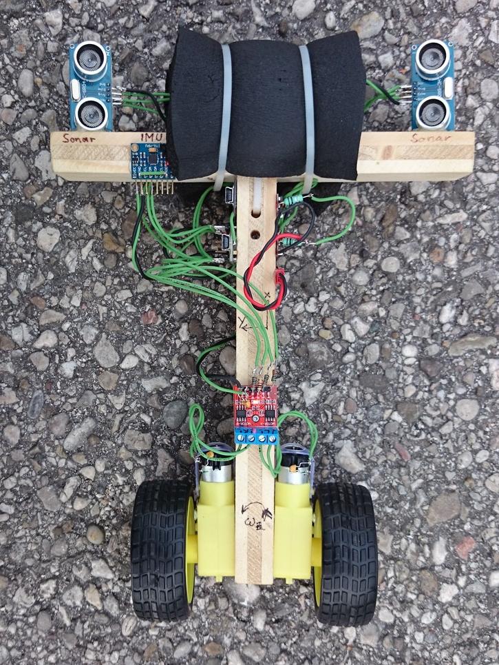 Dieses Sensormodul hat in einem Mikrochip gesamt 6 Sensoren integriert. Es kann in je 3 Achsen die Beschleunigung (Veränderungsrate der Geschwindigkeit, F=m*a oder a=dv/dt) und die Drehgeschwindigkeit messen. Es wird benötigt, um einerseits den aktuellen Kippwinkel zu berechnen, und andererseits um den Roboter auch geradeausfahren lassen zu können. Denn lenken tut der Robo ja durch unterschiedliche Drehgeschwindigkeiten der beiden Antriebsräder. Die laufen aber von hausaus schon ungleich, was dazu führt, dass der Robo ständig leichte Kurven fährt, wenn er geradeaus fahren soll. Ein einfacher Regelalgorithmus sorgt dafür, dass dies kompensiert wird, sodass die Drehgeschwindigkeit um die Hochachse ca. Null ist. 100 mal pro Sekunde werden die Messwerte erfasst und in der Software dann so weiterverarbeitet, dass der Robo aufrecht stehen bleibt, und auf Lenkbefehle richtig reagiert.