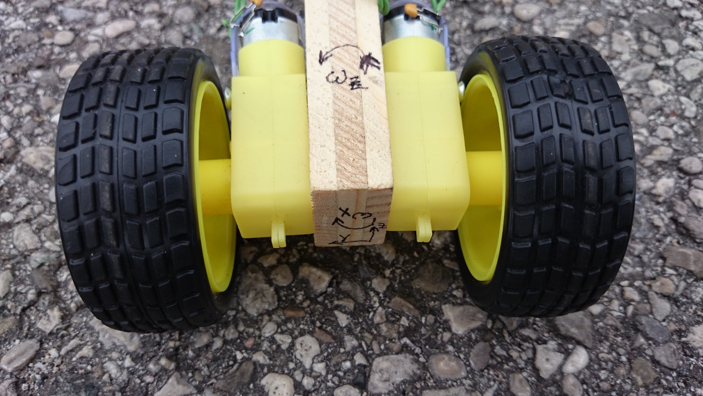 Der Grundkörper des Robos besteht aus 2 Stückchen 19mm 3-Schichtplatte mit je 200x40mm. Das vertikale Holz muss gebohrt werden, sodass die Befestigungsschrauben der Motoren passen, und dass die zur Mitte gerichteten Antriebsstummel, die am Getriebe beitseitig herausgeführt sind, Platz haben.