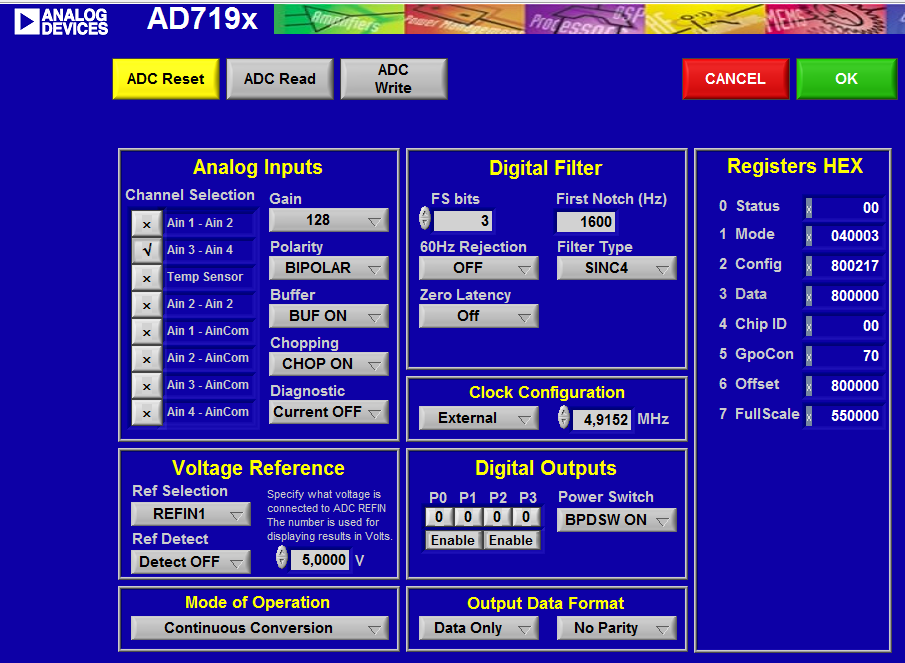 On each ADC only one out of two differential channels is used. See also Mehrkanal Delta-Sigma ADCs und das Abtasttheorem.