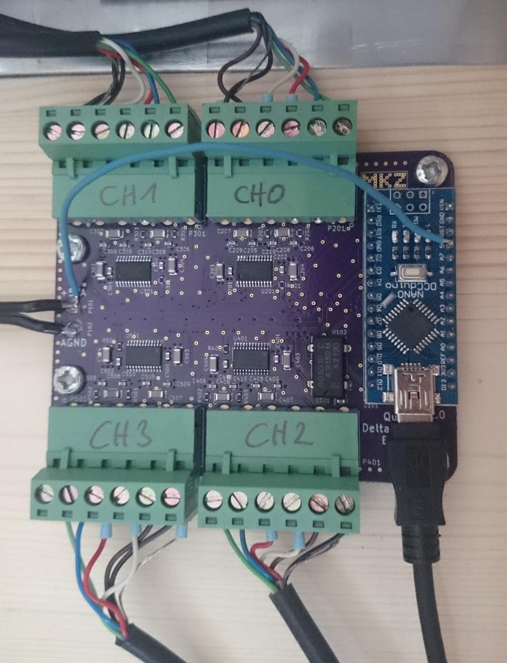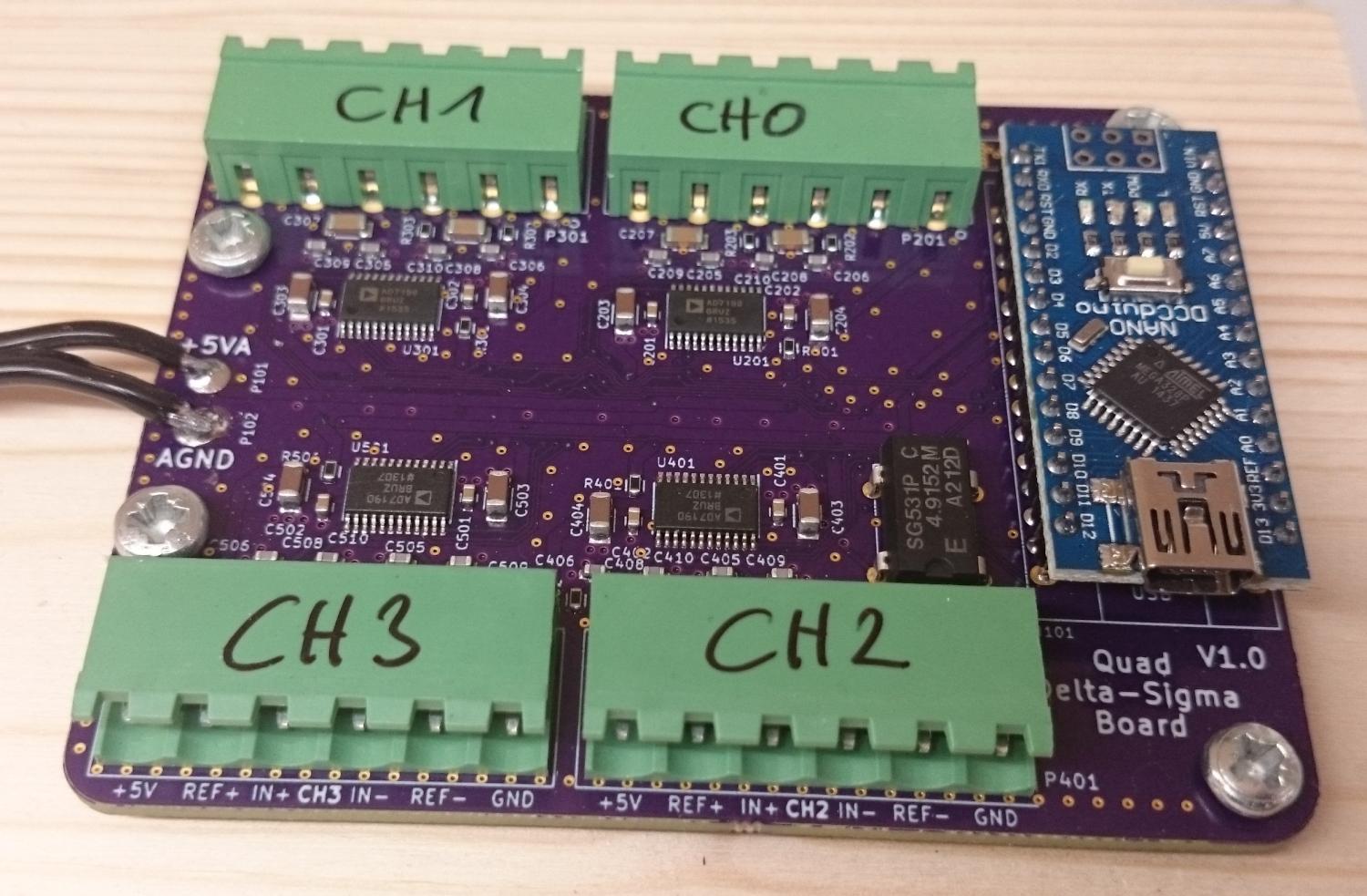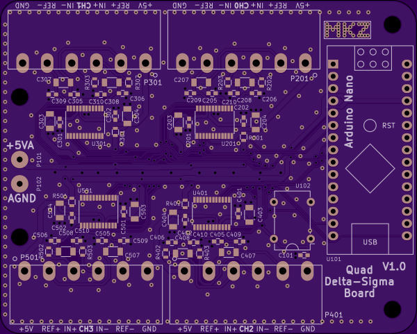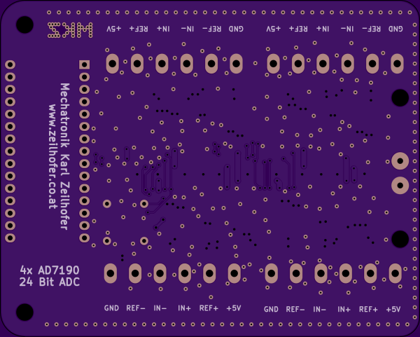 This board implements a 4 channel, ultra low noise, simultaneous sampling, 24 bit ADC. It has a dedicated oscillator and the sync line is conneted to all 4 ADCs. Its indended use is to read out 4 strain gauge weighing cells in a 6-wire configuration.