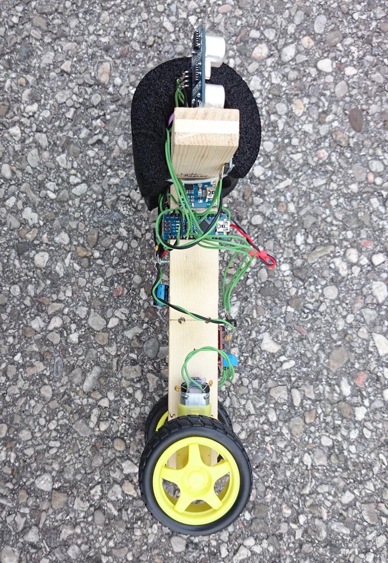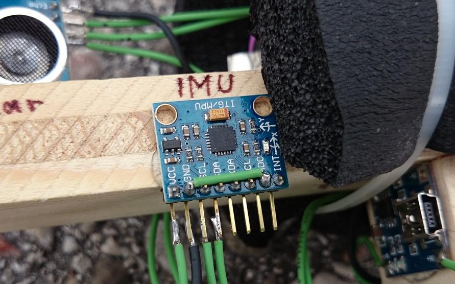 Dieses Sensormodul hat in einem Mikrochip gesamt 6 Sensoren integriert. Es kann in je 3 Achsen die Beschleunigung (Veränderungsrate der Geschwindigkeit, F=m*a oder a=dv/dt) und die Drehgeschwindigkeit messen. Es wird benötigt, um einerseits den aktuellen Kippwinkel zu berechnen, und andererseits um den Roboter auch geradeausfahren lassen zu können. Denn lenken tut der Robo ja durch unterschiedliche Drehgeschwindigkeiten der beiden Antriebsräder. Die laufen aber von hausaus schon ungleich, was dazu führt, dass der Robo ständig leichte Kurven fährt, wenn er geradeaus fahren soll. Ein einfacher Regelalgorithmus sorgt dafür, dass dies kompensiert wird, sodass die Drehgeschwindigkeit um die Hochachse ca. Null ist. 100 mal pro Sekunde werden die Messwerte erfasst und in der Software dann so weiterverarbeitet, dass der Robo aufrecht stehen bleibt, und auf Lenkbefehle richtig reagiert.