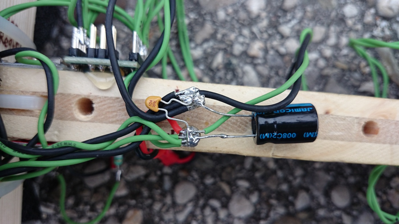 Die Stromverteilung zu all den verschiedenen Platinen erfolgt über einfache Schrauben, die als Lötstützen verwendet werden. Hier sind auch zwei Kondensatoren angebracht. Einerseits ein Aluminium-Elektrolyt-Kondensator zur Stützung der Spannungsversorgung bei Stromspitzen und außerdem noch ein kleiner Keramikkondensator zur Entstörung.