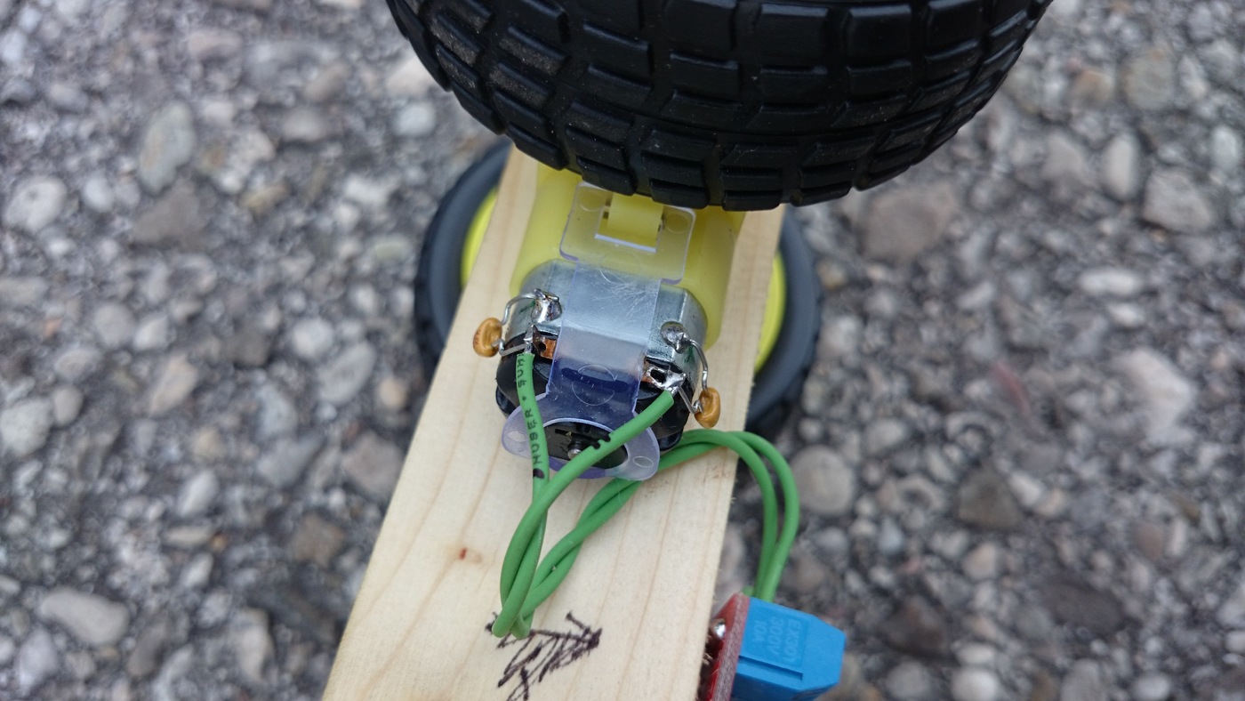 Den Antrieb übernehmen zwei Getriebemotoren, mit einer Untersetzung von 48:1. Nominell können sie mit 6V betrieben werden, hier werden sie mit 5V angesteuert. Der Elektromotor muss vor dem verbauen aus dem Getriebegehäuse genommen werden, und umgedreht werden. Dadurch schauen die elektrischen Kontakte dann zum Reifen, und sind daher leicht zugänglich. Dies ist notwendig, weil ansonsten der Reifen auf jene Halb-Antriebswelle gesteckt werden würde, die mit der anderen Hälfte nur durch eine Steckverbindung gefügt ist. Nach längerem Betrieb lockert sich diese Verbindung, und rutscht durch. Die andere Hälfte bildet ein Spritzgussteil mit dem Zahnrad im Inneren des Getriebes, ein durchrutschen ist daher ausgeschlossen.