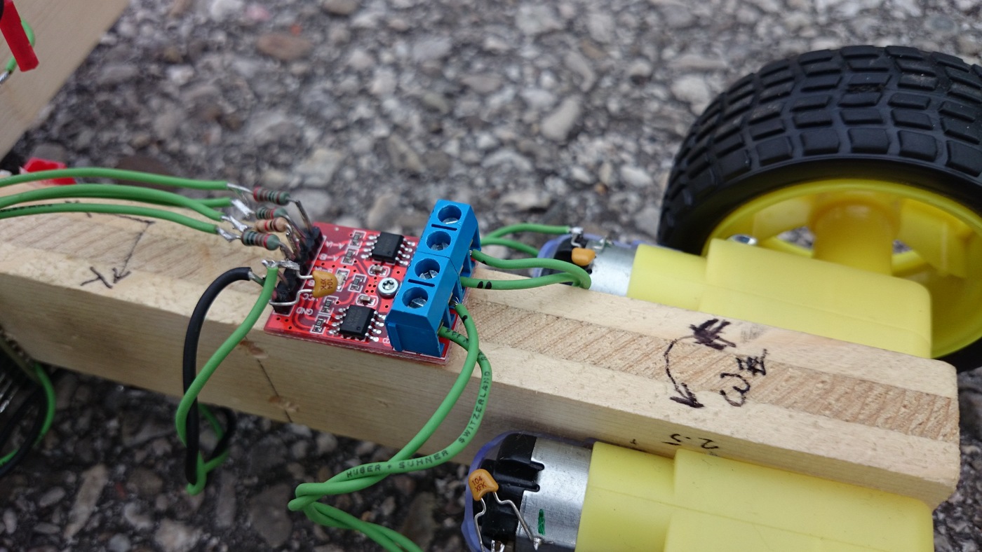 Um die Motoren in beide Richtungen drehen lassen zu können, wird ein Doppel-H-Brücken-Modul verbaut. Es wird einerseits direkt mit 5V versorgt, und andererseits hat es 4 Eingangspins, mit denen jede der 4 Halbbrücken angesteuert wird. Der Arduino steuert diese mit einer Pulsweitenmodulation mit einer Frequenz von 1kHz an. Dadurch können die Motoren nicht nur schnell nach vorne und schnell nach hinten, sondern quasi stufenlos jede Geschwindigkeit fahren. Auch hier wurde eine Entstörmaßnahme verbaut: Die Ansteuerleitungen haben je einen Reihenwiderstand von 1kOhm integriert. Die H-Brücken sind nicht gerade besonders Rückwirkungsfrei, d.h. energiereiche Störungen von der Motorseite gelangen zurück auf die Ansteuerpins.