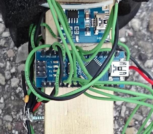 Das besondere an den hier verwendeten Modulen ist, dass sie zusätzlich gleich auch noch einen Hochsetzsteller integriert haben, der aus der variablen Batteriespannung von 3-4.2V konstante 5V erzeugt. Ein elektronischer Hochsetzsteller ist vom Prinzip her dem mechanischen Wasserwidder sehr ähnlich.