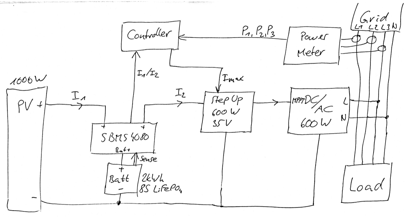 Die Intelligenz muss eine selbstgemachte Steuerung übernehmen, die all die Signale vom BMS und dem Leistungsmessgerät heranzieht, um möglichst keinen Strom an den Netzbetreiber zu verschenken.