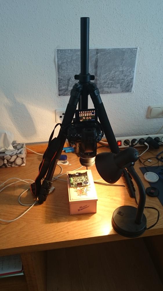 The big advantage in this setup is, that it leaves enough space between the lens and the PCB for handling and working. Also the speed (no time lag) is perfect. It's easy to grab the PCB and bring the parts of interrest into focus. With an external trigger cable, taking pictures is very easy too.