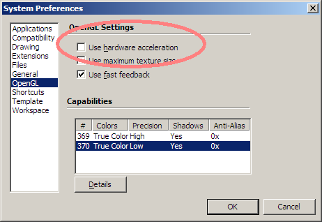 Einstellen kann man das unter „Window → Preferences → OpenGL → Use Hardware accelleration“